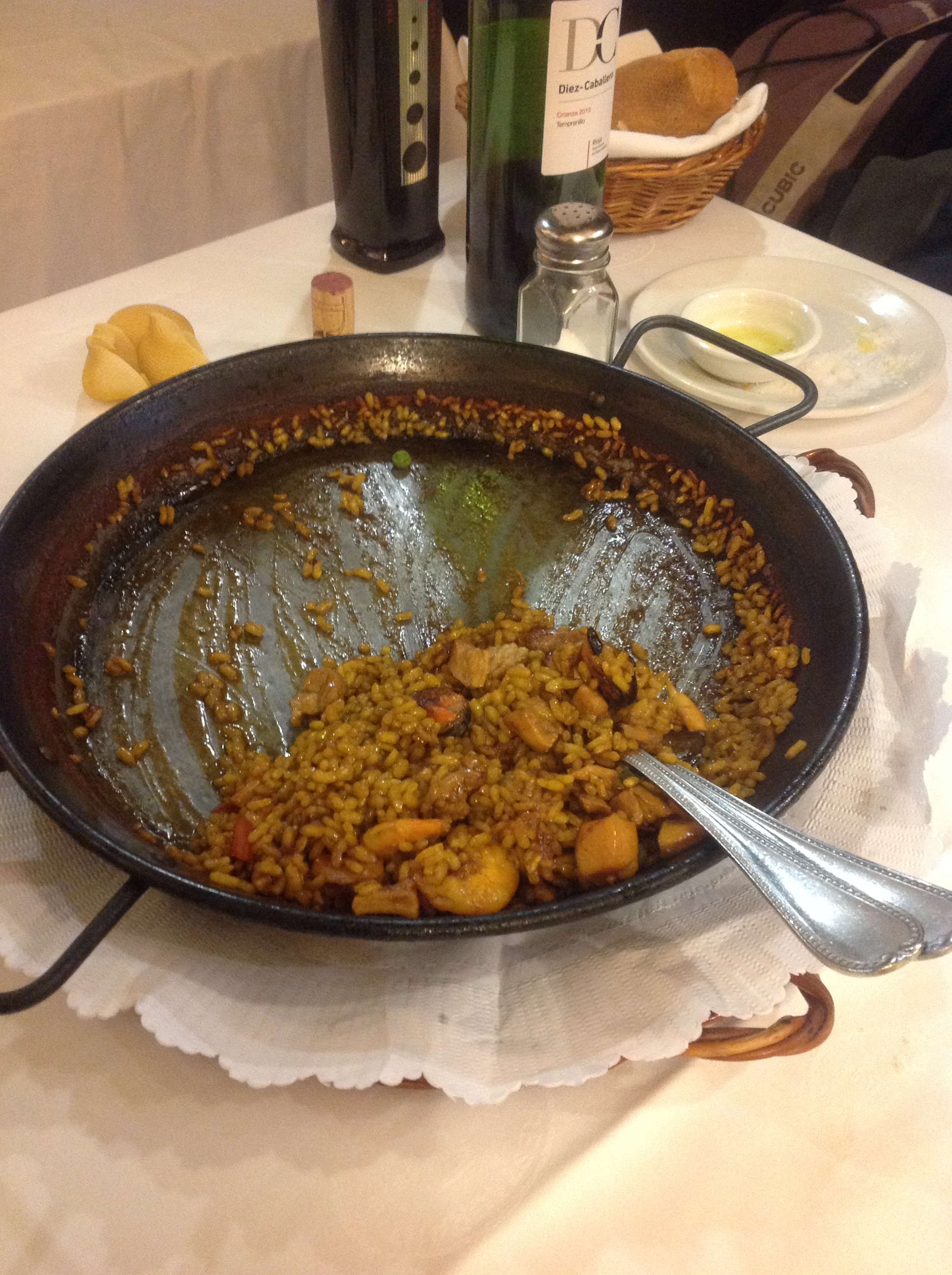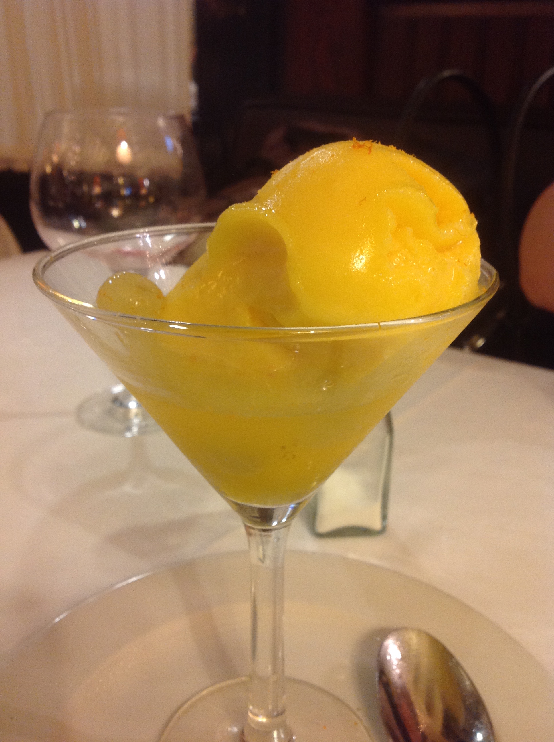 Our main course was paella Parellada (named after Paco Parellada who took over the restaurant in 1942 and whose family continue to run it today) with both meat and fish. Since we’re not in Valencia I figured we could mix the two! Overall the dish was OK, but lacked socarrat – the caramelized crust – which is the sign of a good paella, or good paella chef. We finished dinner with a very refreshing mandarin and champagne sorbet which was smooth and bursting with fruit flavour.