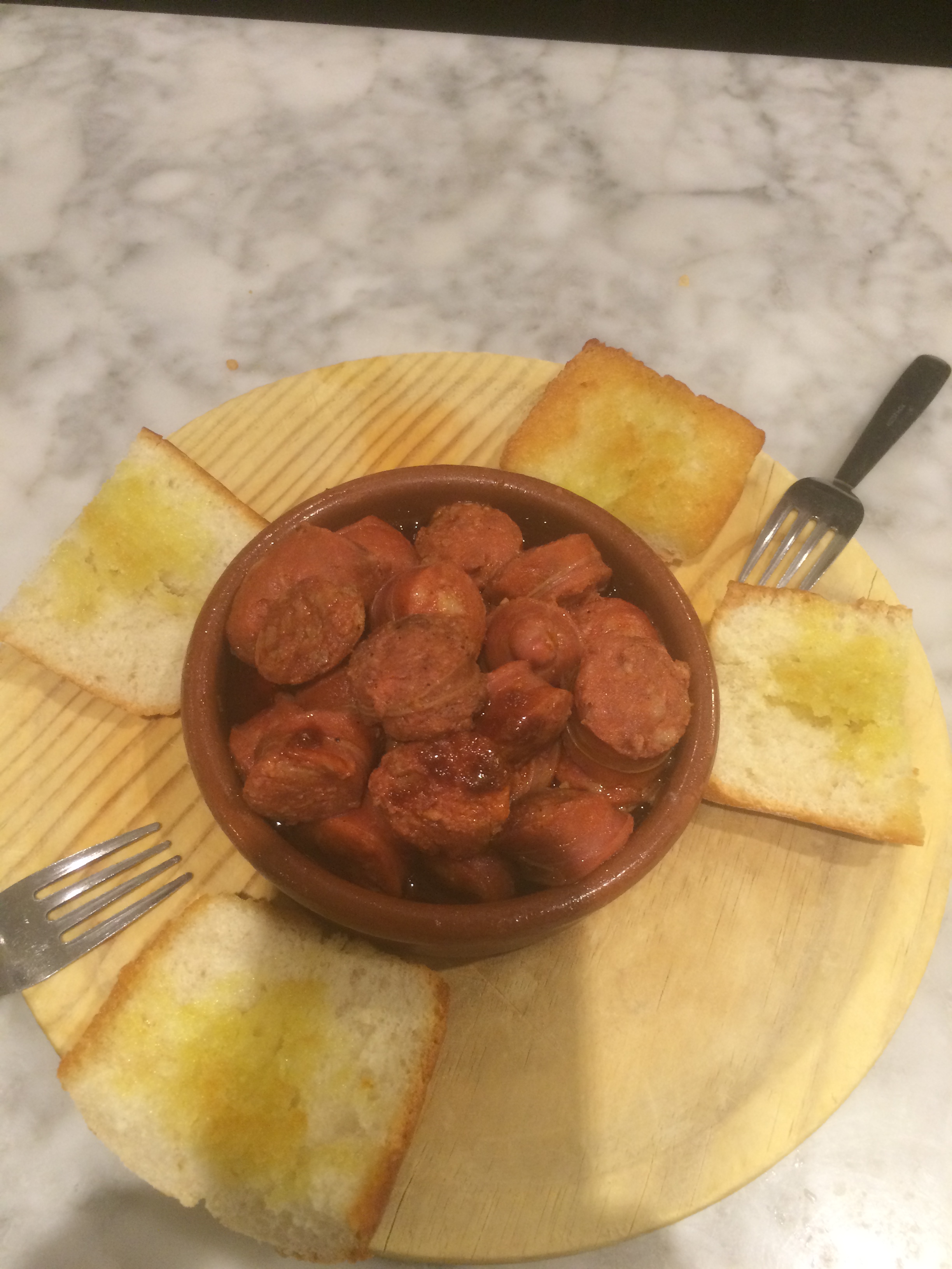 We have a beer and some olives whilst deciding what to order from the menu. In the end we go for the plato combinado (a selection of iberico ham, salami, sausage and chorizo) with pá de coca tornado con tomate. We follow this with some Morcilla de Burgos, Calamari a la Andaluza and Choricitos a la sidre. In hindsight we should have substituted one of the meat dishes for a lighter vegetable dish, or just added a vegetable dish and got somebody else to join us!!.