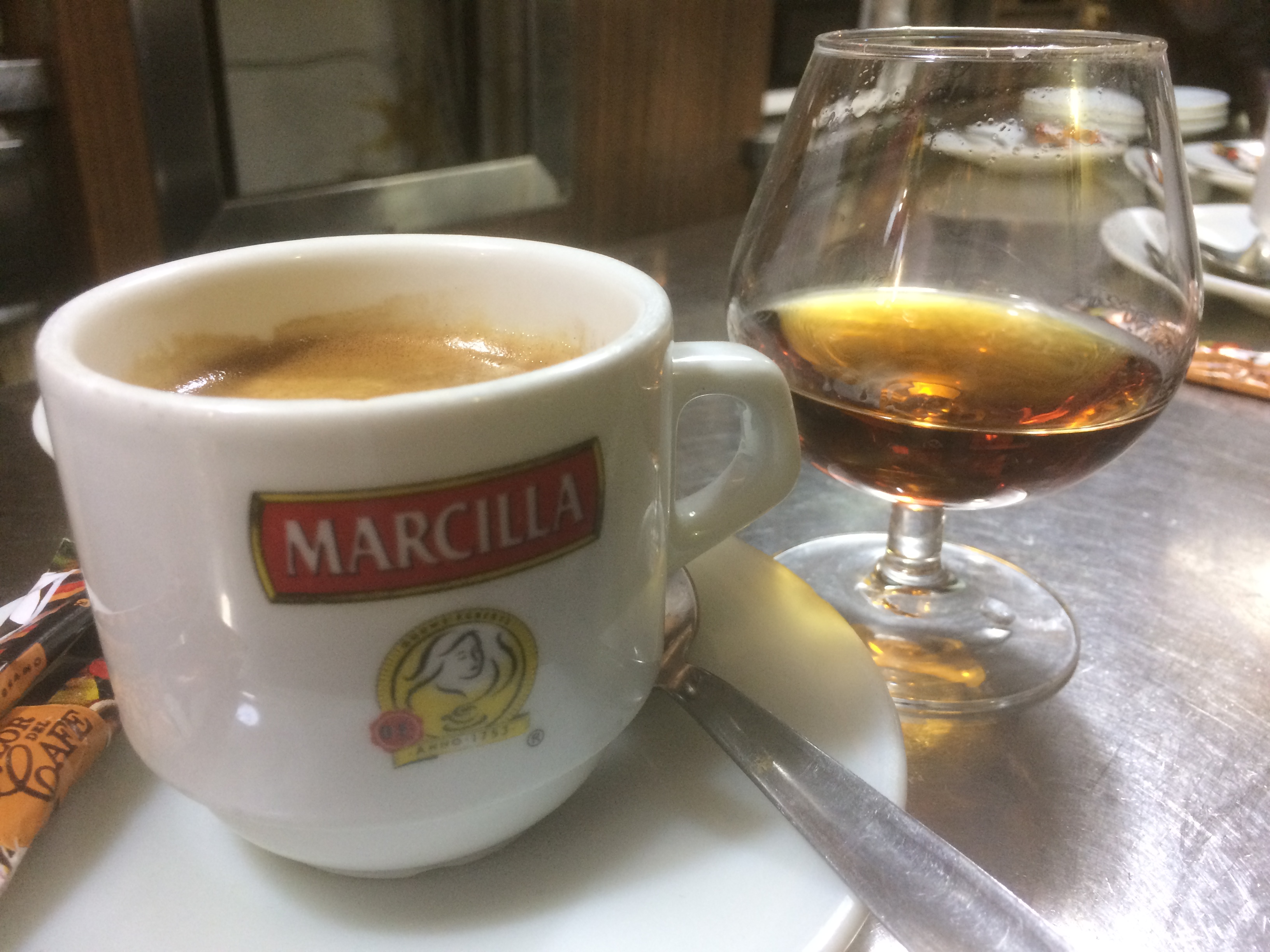 So breakfast eaten, shopping done, we just have time for a walk along Passeig de Gràcia, looking at the upmarket clothes shops and jewellers. The streets aren’t crowded and the shops don’t seem to be that busy. We walked quicker than planned so we had time for a coffee in Luria 2. Unfortunately I don’t know the Spanish for milk, so had to have a brandy instead. ¡Salud!