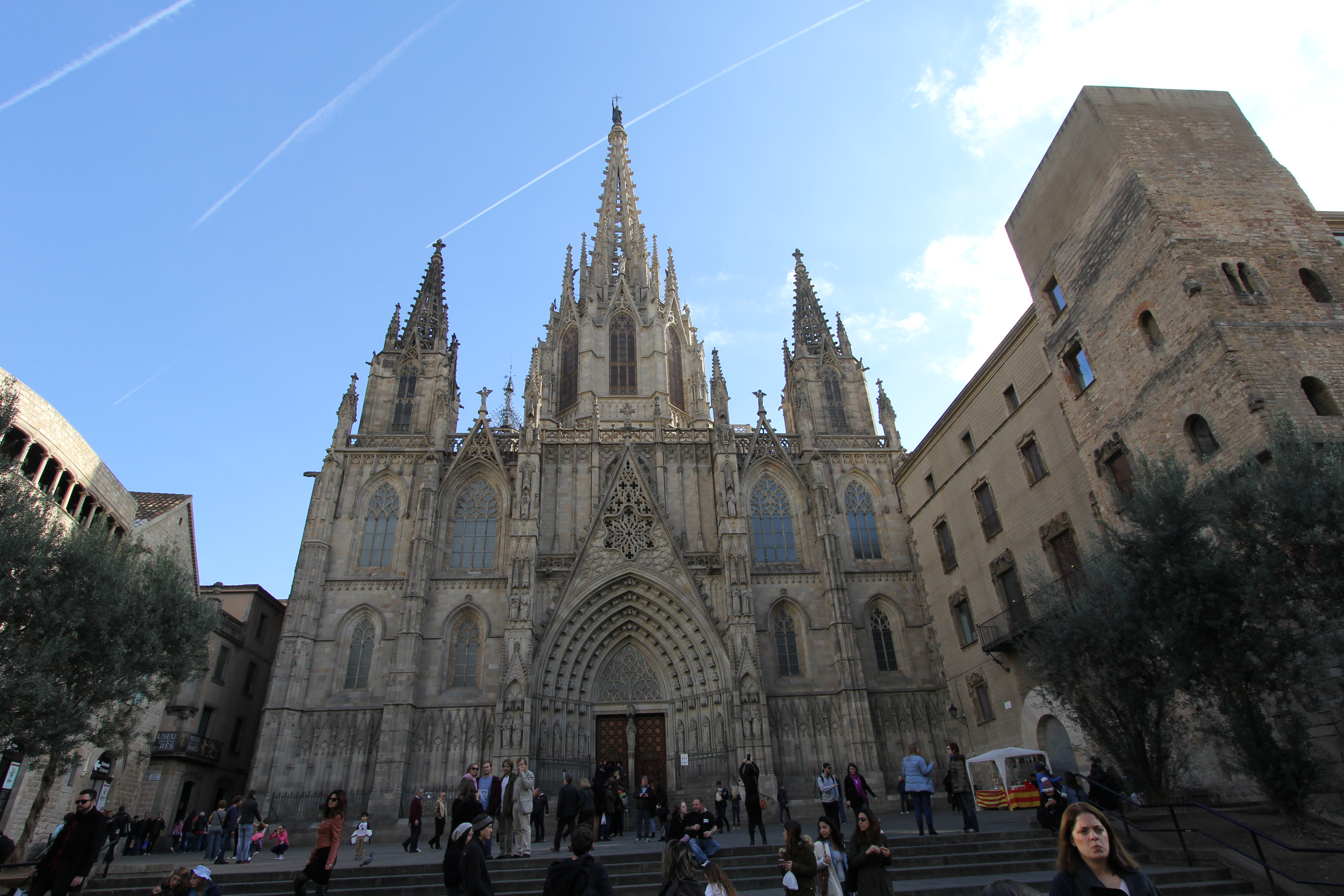 Unsurprisingly Barcelona’s Gothic cathedral Catedral de la Santa Creu i Santa Eulalia, Cathedral of the Holy Cross and Saint Eulalia, also known as La Seu, is located in the heart of the Gothic Quarter, Barri Gòtic. We climb the steps to the cathedral and join the short queue to enter.