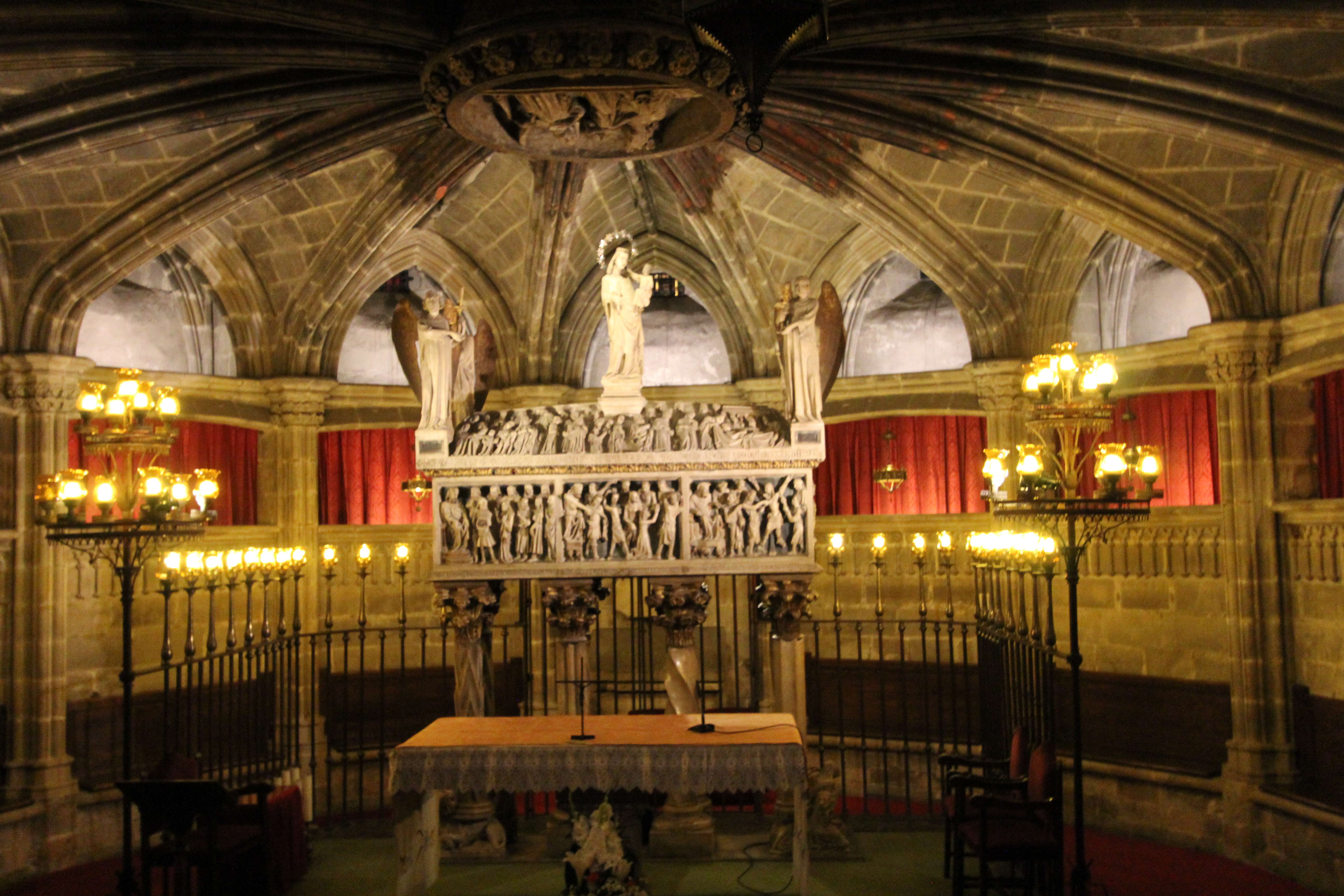The crypt, which is below the high altar, contains the sarcophagus of Santa Eulalia, the13-year-old who was martyred by the Romans in Barcelona during the reign of Emperor Diocletian.