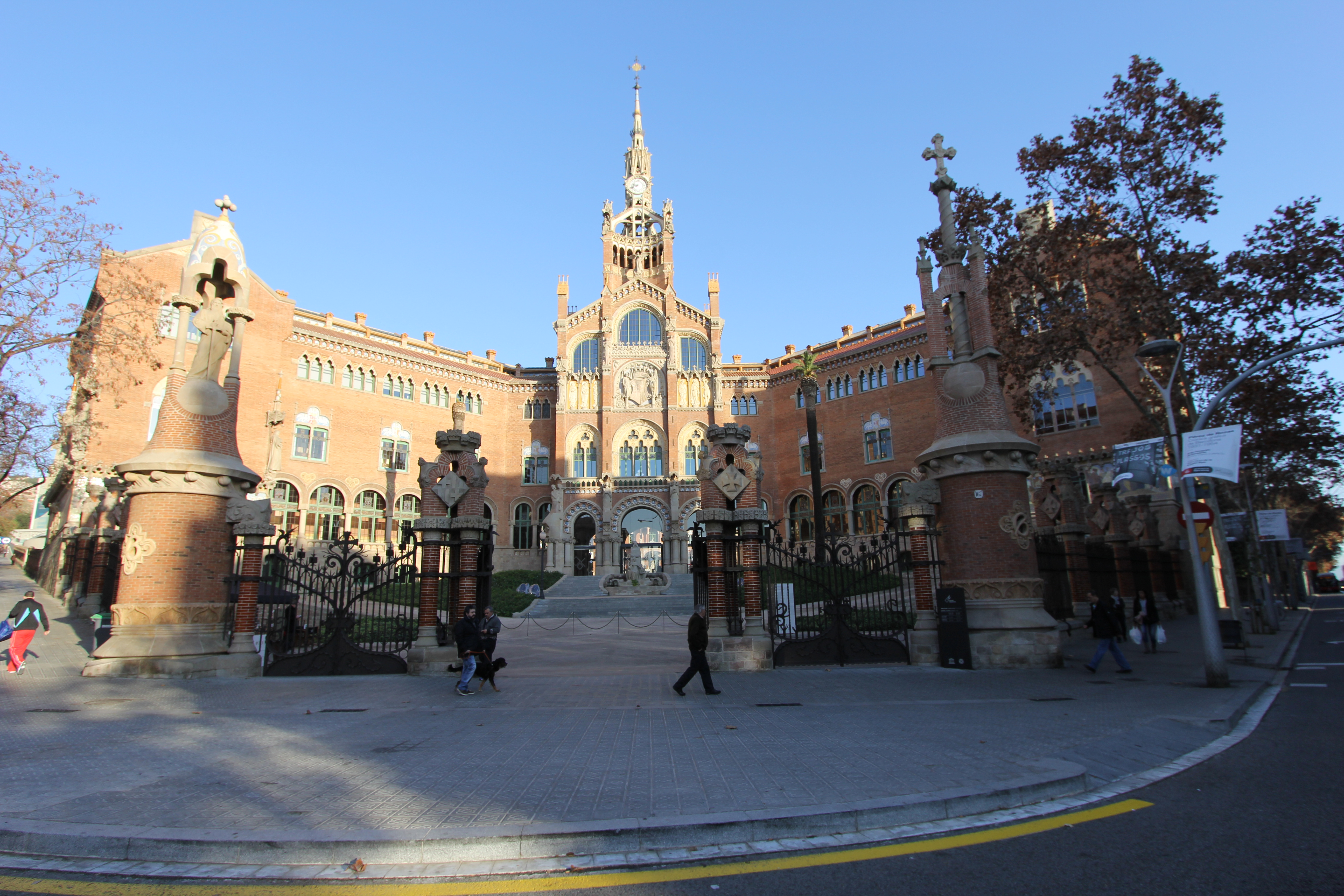 Our first stop of the day is the Hospital de la Santa Creu i Sant Pau. We take the Metro from Gracia, Line 4 (Direction Trinitat Nova) to Guinardó / Hospital de Sant Pau. After checking directions we walk down the hill from the new hospital to the Modernista Sant Pau Complex. Designed by Lluís Domènech i Montaner as a garden city for nursing the sick it was built between 1905 and 1930.