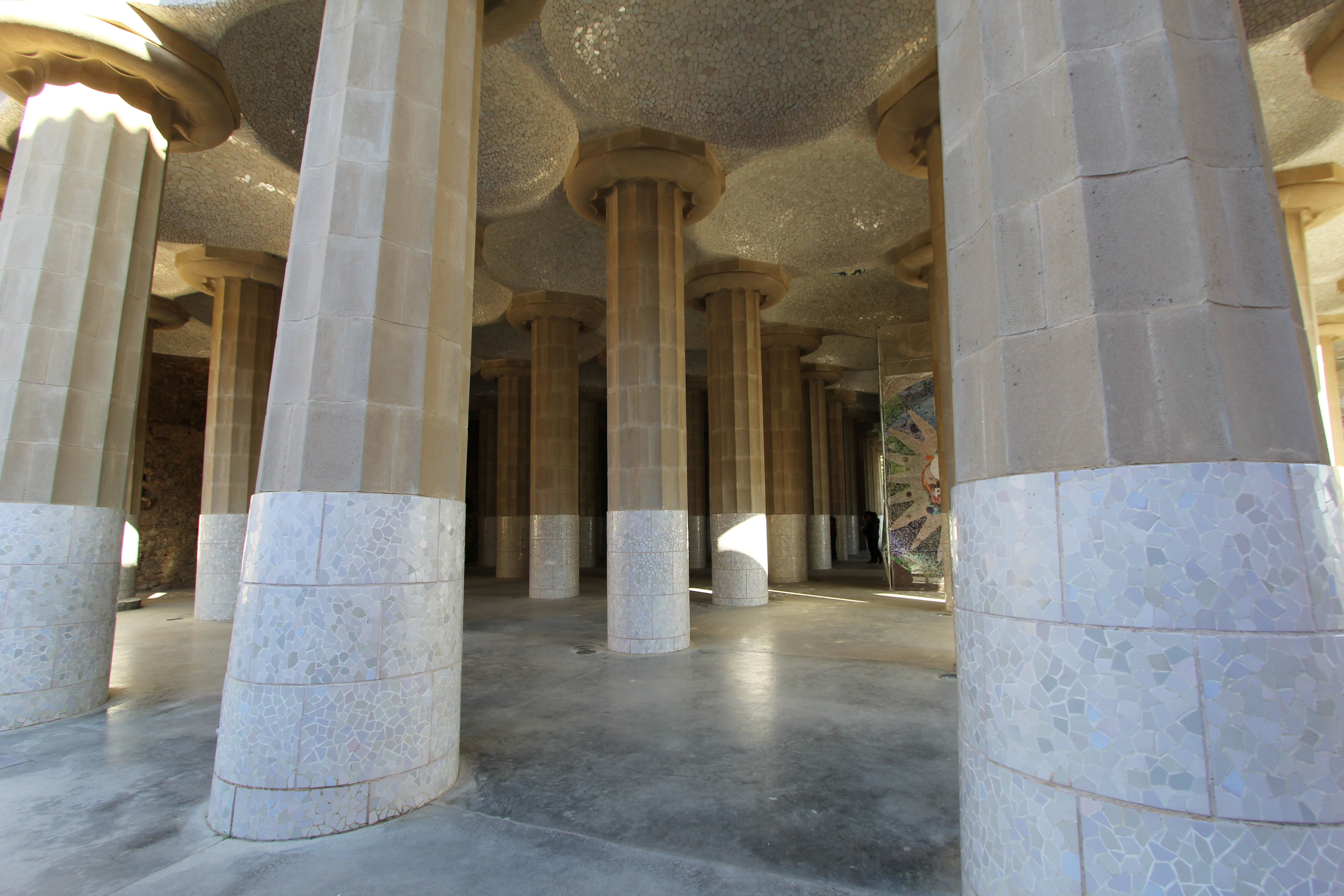 Designed to serve as the market place for the estate, it is made up of 86 Doric-style columns, the base of which are clad in mosaic tiles, enabling them to be wiped clean by the market stall holders. Some sections of the room, look like church naves. The ceiling is formed of small domes constructed from clay bricks and decorated with original tile-shard mosaics which were brought in by the artisans working on the project and supervised by Josep Jujol, one of Gaudí’s assistants.