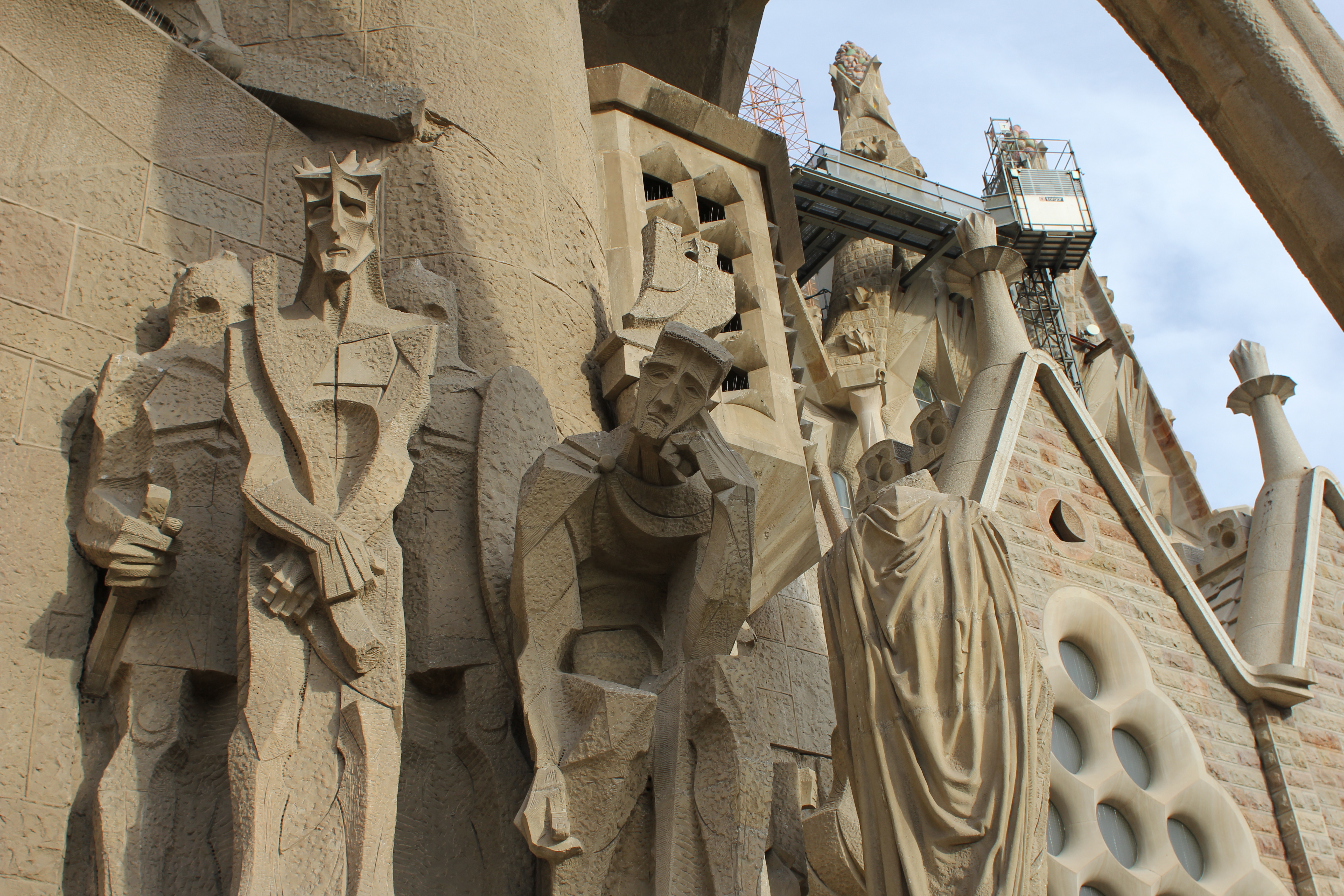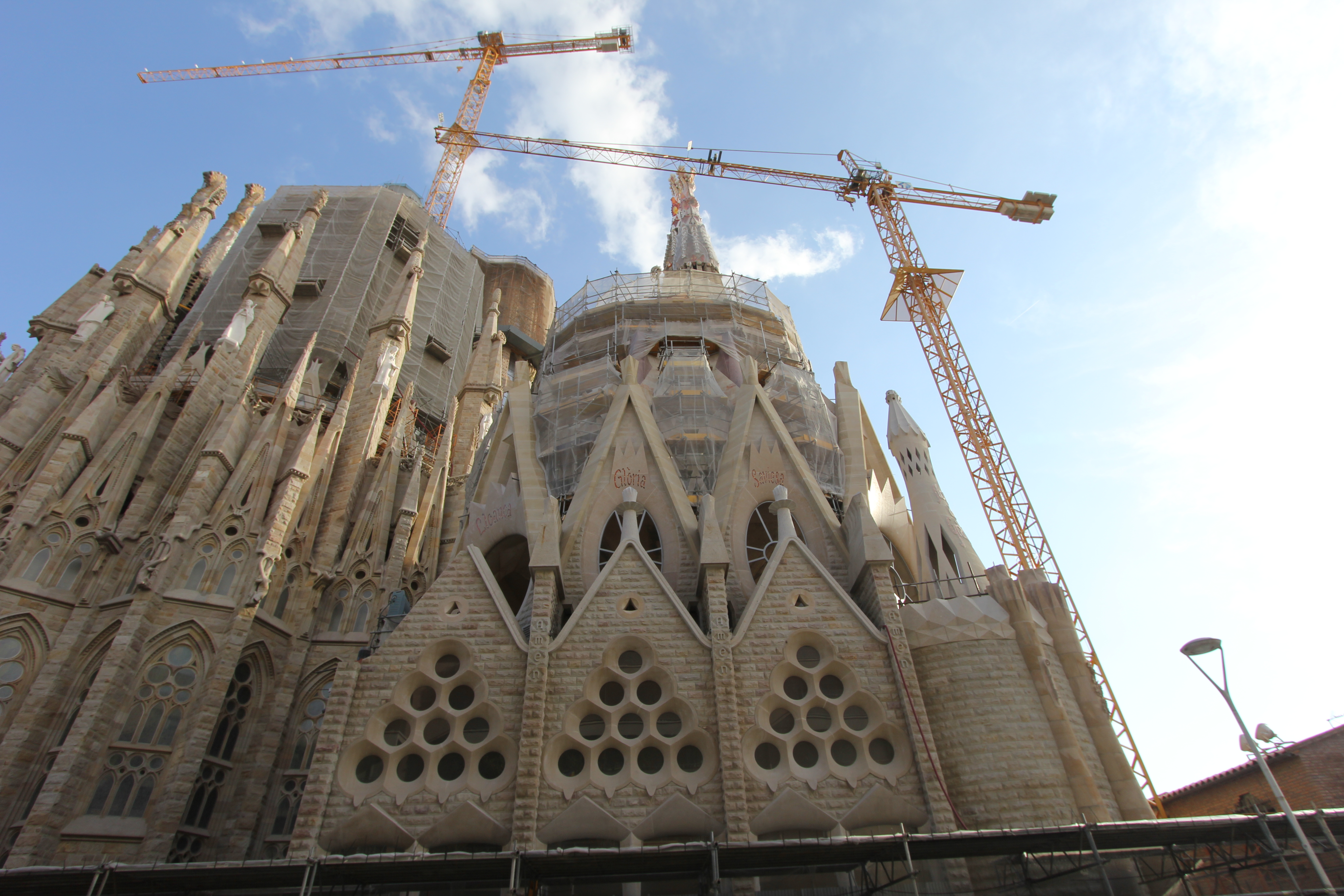 The neo-Gothic facade of the Cathedral was created by the architect José Oriol Mestres between 1887 and 1890 under the patronage of the banker Manuel Girona. Situated in the centre of the façade the main door is made up of a large Gothic arch with archivolts. There is a sculpture of Christ over the mullion and images of the twelve apostles are arranged along the sides of the door together with numerous figures representing kings, prophets, angels and saints. Of the eight stained-glass windows on the façade, some are modernist and others, like the famous Noli me tangere by Bartolomé Bermejo, are from the Renaissance. Two side towers with tall pinnacles were added between 1896 and 1898; the cimborio, which crowned by the image of Saint Helena, was constructed between 1906 and 1913.