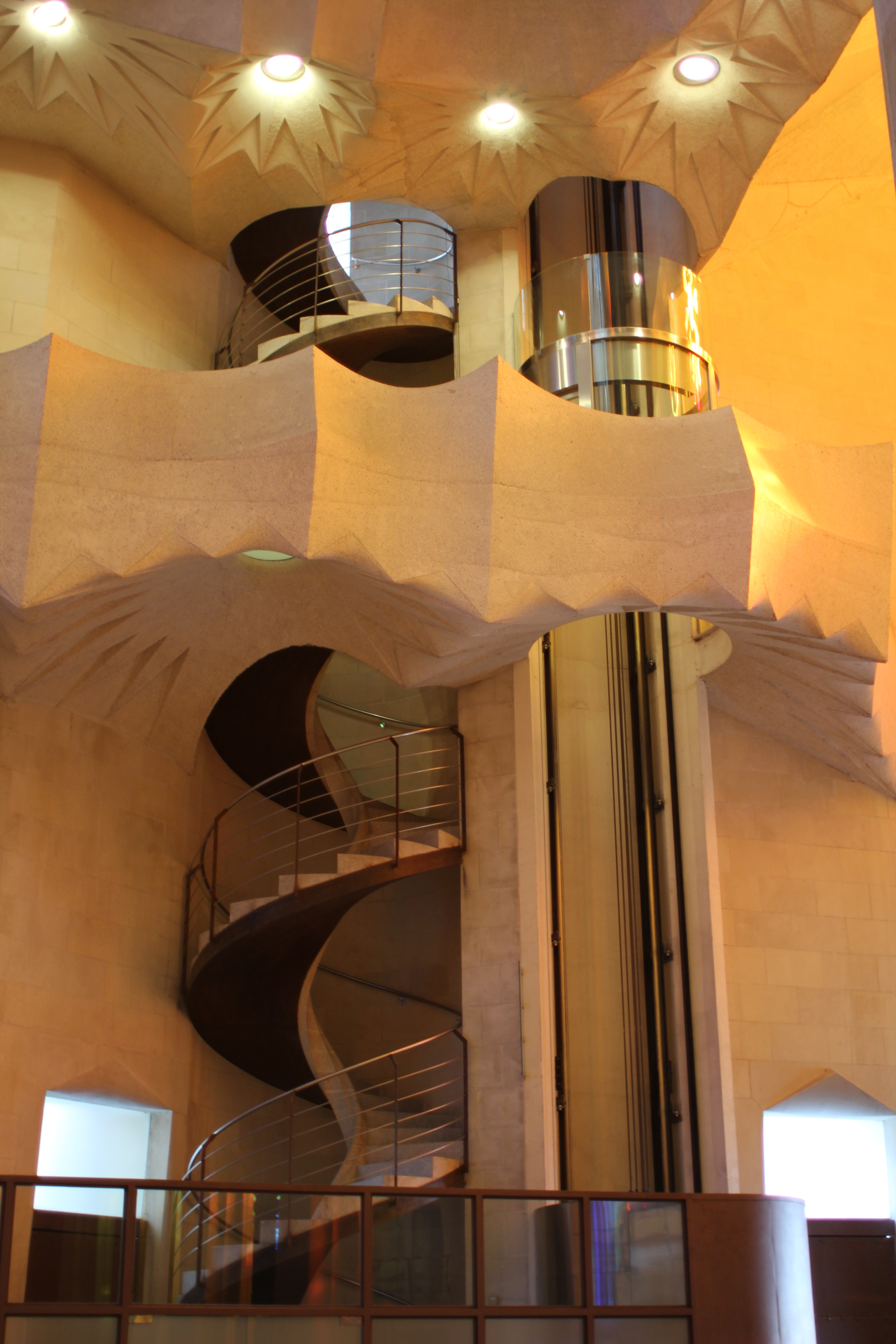 On the eastern side of the Greek Theatre square there is an original iron door which leads to where there used to be the gardens of Casa Larrard, the former mansion that Güell adopted as his own house, but which has since 1931 been a school. The route, which runs at a level higher than that of the house, passes through a pine grove with the portico backing onto a retaining wall made from un-worked stone. The portico adopts the shape of a great wave atop slanting columns, with a double colonnade that acts as a buttress. It is one of the finest examples of the organic architecture upheld by Gaudí. The same meaning, at once structural and aesthetic, can be appreciated in the spiral ramp which takes visitors down to the house, at the end of the path.