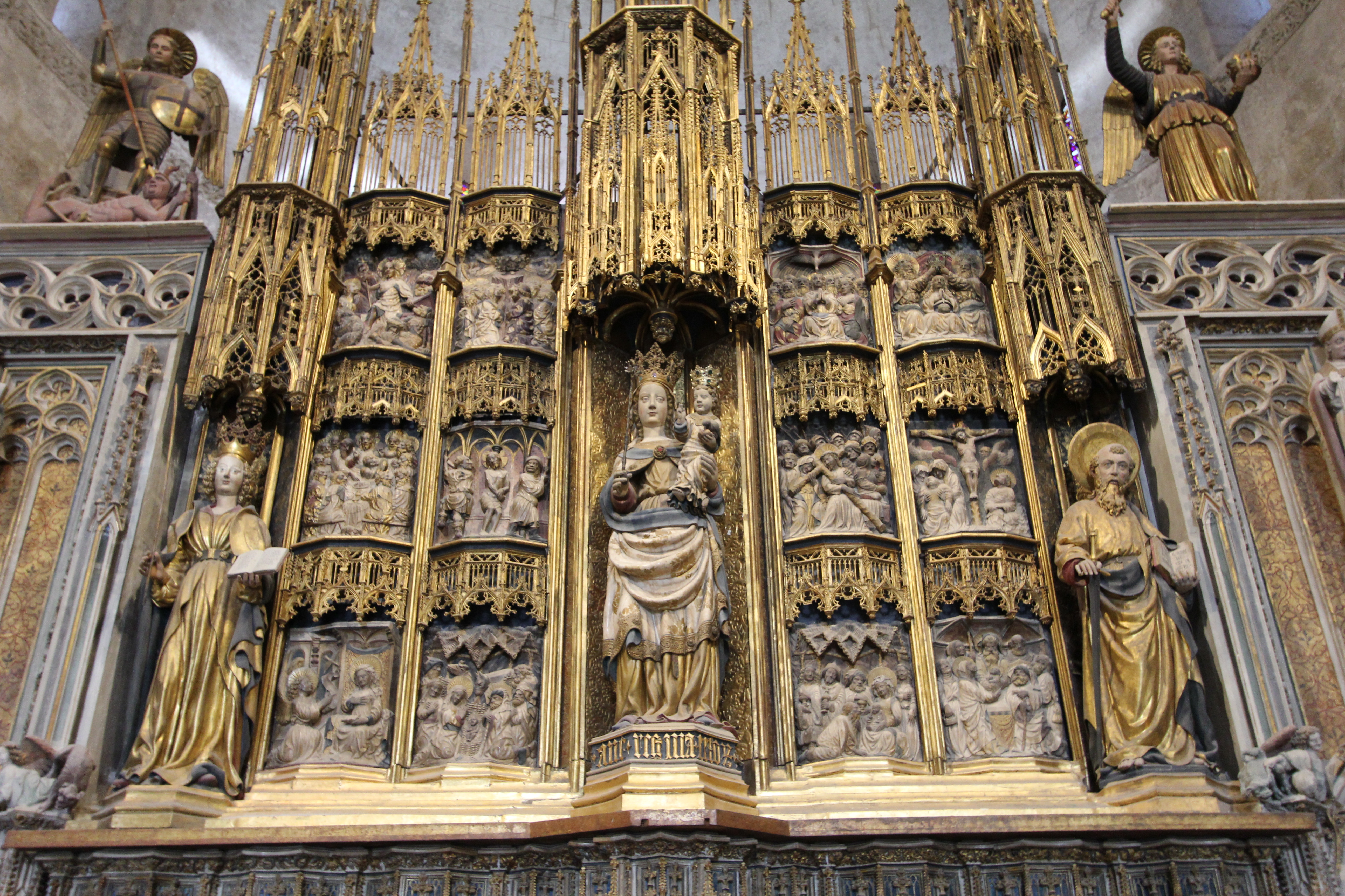 We complete our visit to the cathedral with another look at the beautiful choir at the centre of the nave with magnificently carved choir stalls which have rich patina developed through hundreds of years of use. The enclosure around the choir is decorated with reliefs that narrate the life of Santa Eulalia.