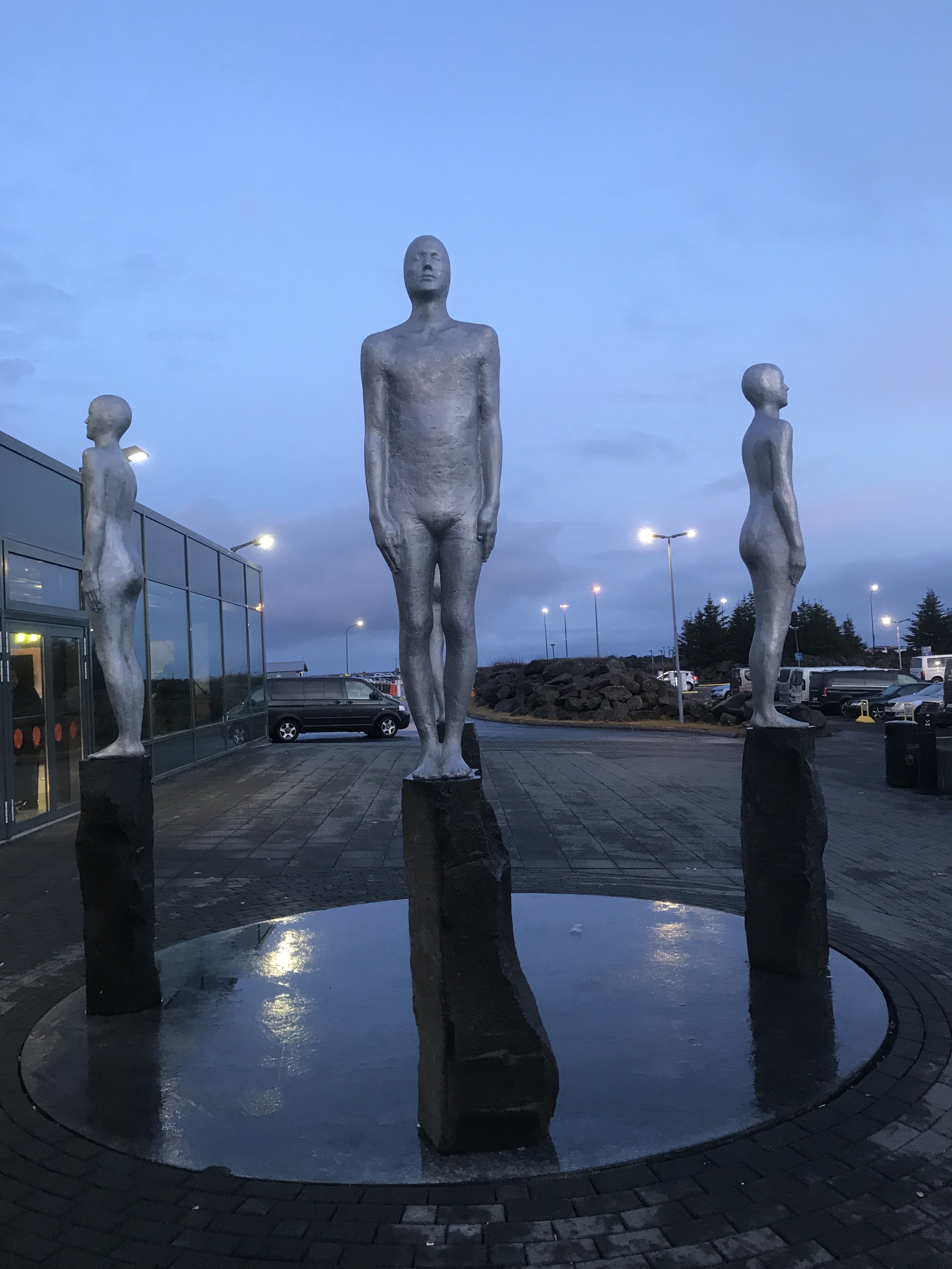 Áttir (Directions, 2007) is a sculptural installation by the Icelandic sculptor, Steinunn Þórarinsdóttir. Originally installed inside the airport it was relocated and is now installed outside the arrival building. It features four human-like figures all cast in aluminium from the same mould. Standing on Icelandic basalt columns, each figure faces one of the four cardinal directions: north, south, east and west.