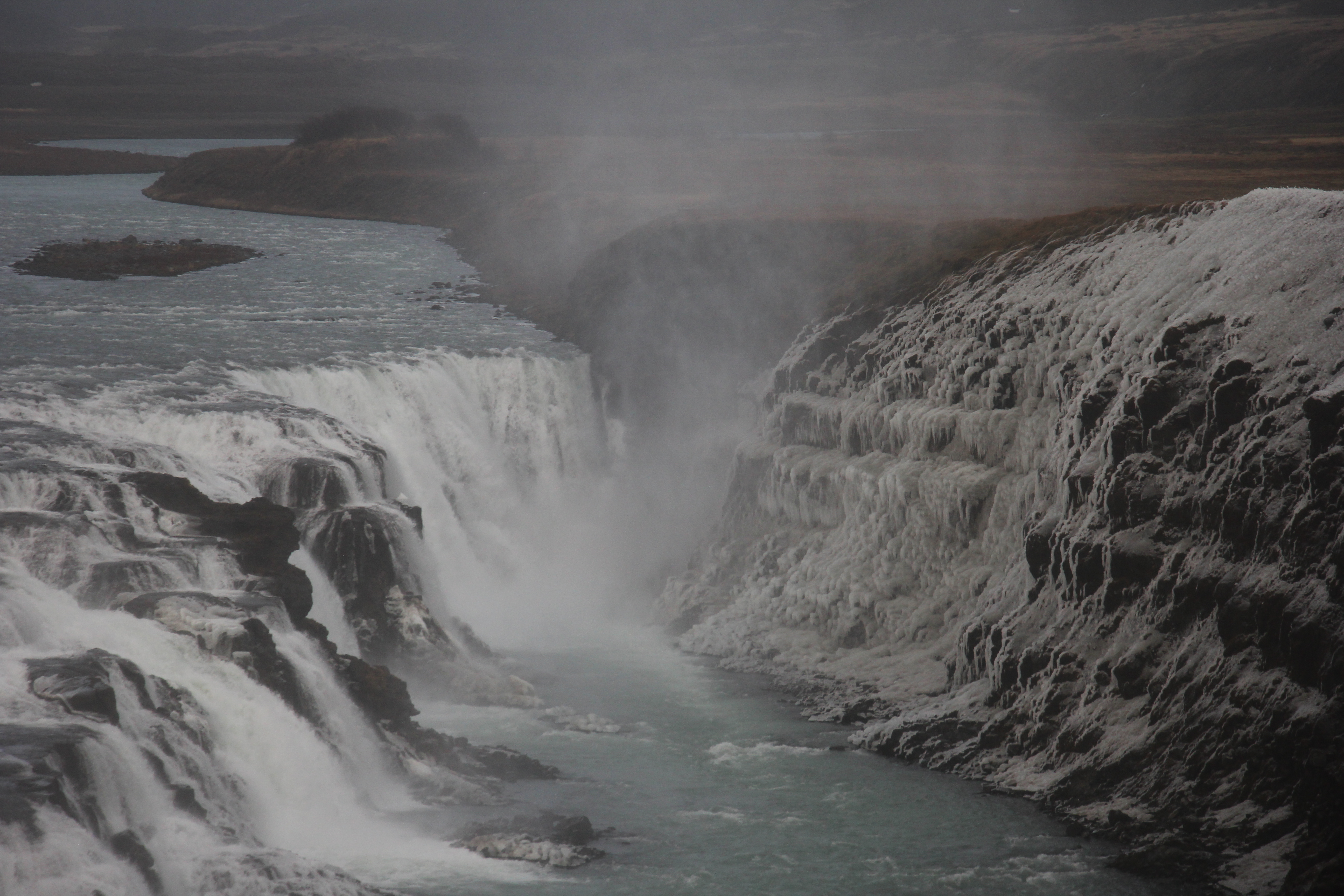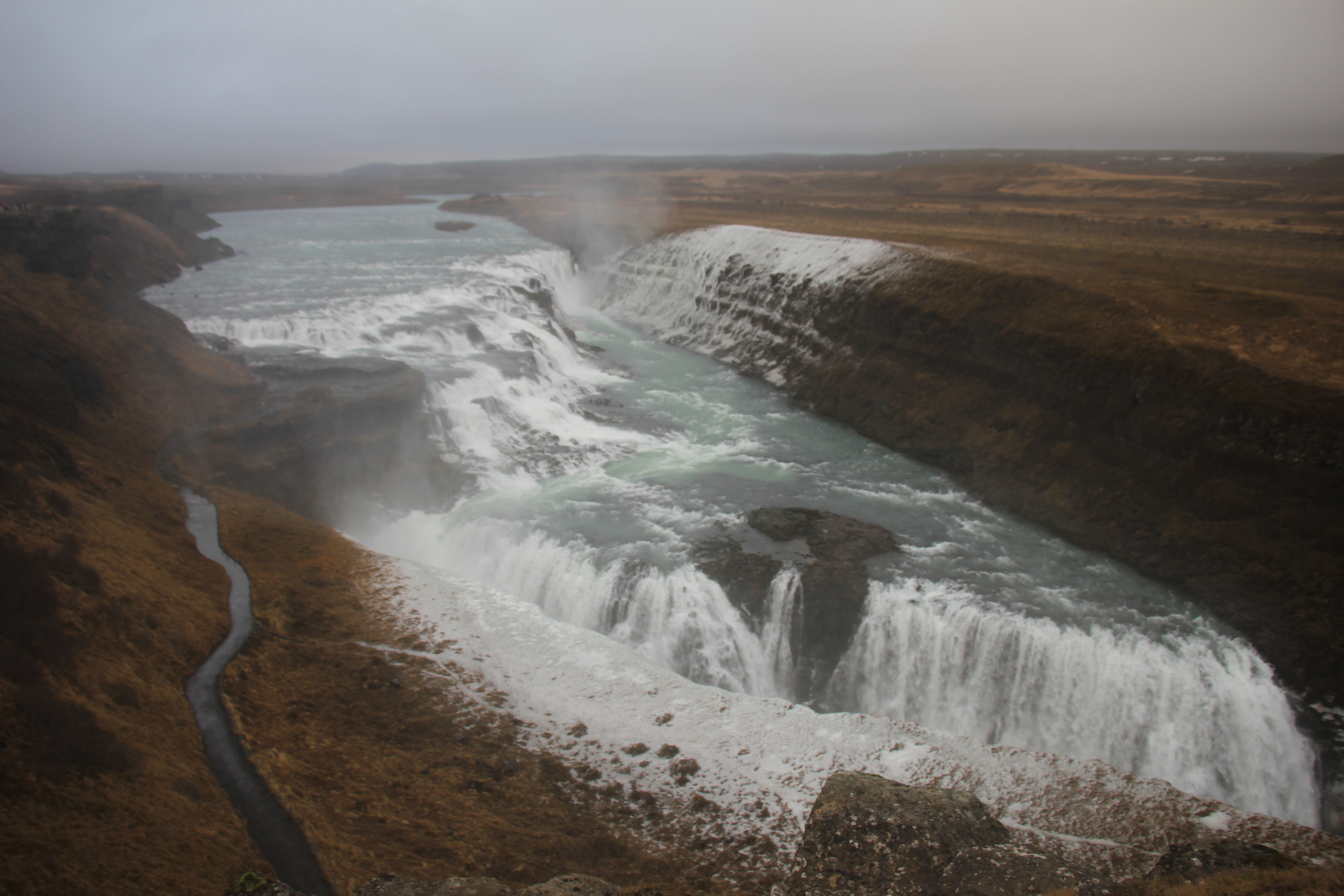 Gullfoss or ‘golden falls’ is located on the Hvítá (White) river which is fed by Iceland´s second biggest glacier, the Langjökull. Although it is known as the golden waterfall, on an overcast day it was more golden brown, but spectacular nevertheless. The waterfall is unusual because of its two tier or two step drop, water falls 32 metres in two stages into a rugged and narrow canyon with walls which reach up to 70m in height.