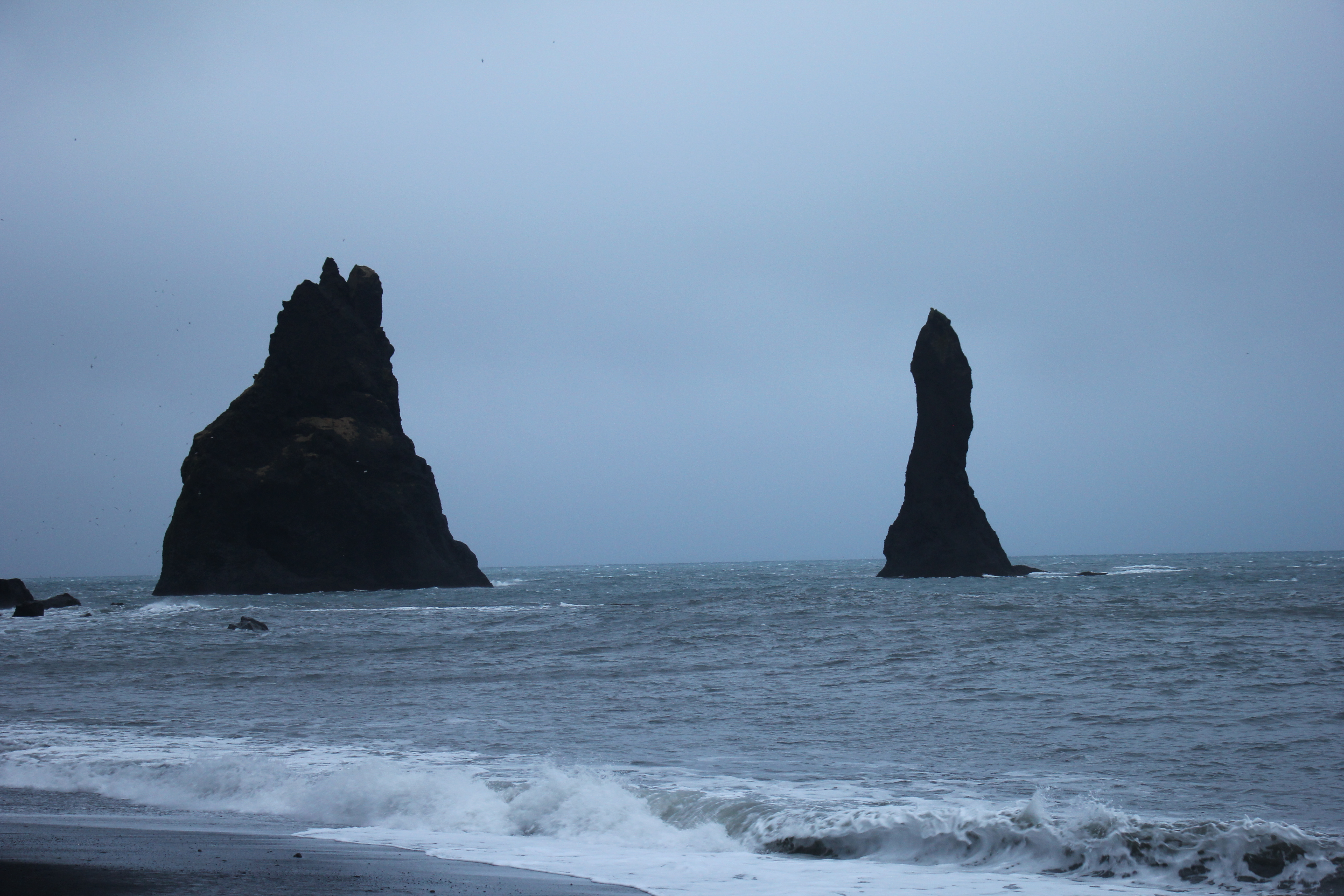 From the beach we have a close up view of the spiky basalt sea stacks which rise 66 metres from the ocean into the air. But these sea stacks are not a natural phemonemna. According to local legened two trolls saw a ship sailing near the shore at night so they waded out to it. Dawn broke as the trolls were returning to shore and they were turned to stone together with the ship.