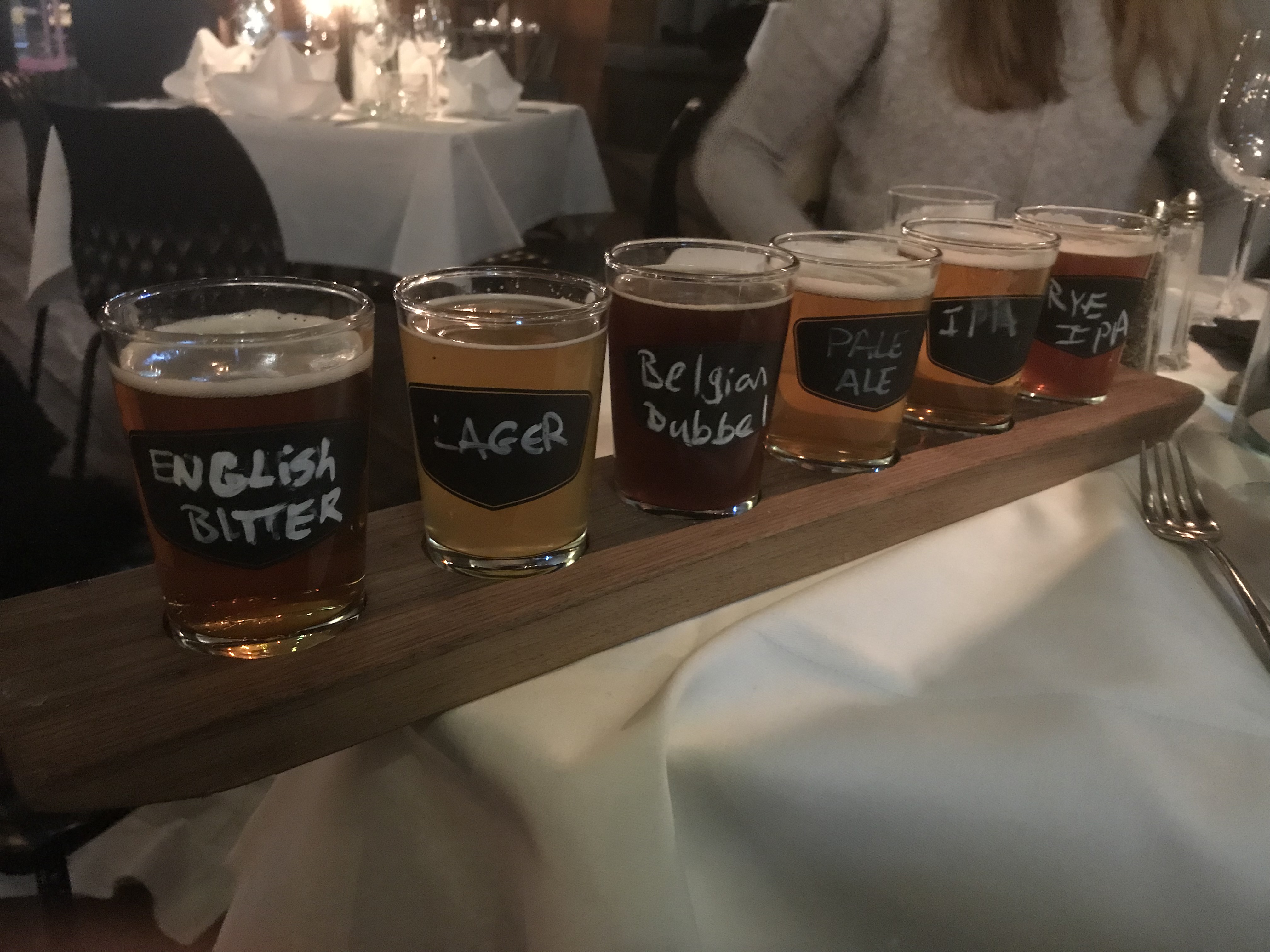 Whilst waiting for a table we ordered drinks a flight of six beers: English Bitter, Lager, Belgian Dubbel, Pale Ale, IPA, and Rye IPA. Fortunately given that this was a shared rather than a solo flight, Sue, Josh and I each found our two favourite beers. No sooner had our flight arrived it was time to depart for our table.
